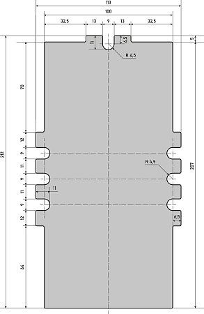 Тиски имеют 7 пазов открытого типа, что позволит закрепить их на любом рабочем столе. На схеме изображены ключевые размеры.