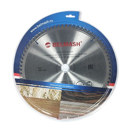 Диск пильный по ламинату BELMASH 305x3,2/2,2x30 72T твердосплавными напайками, которые делают зубья износостойкими, способными сопротивляться повышенным ударным нагрузкам.