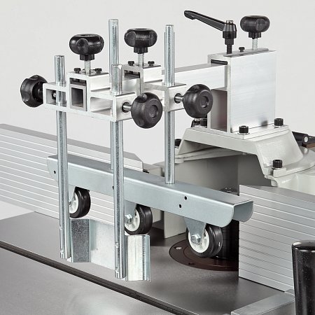 Станок оснащен прижимным узлом, который помогает в подаче заготовки к режущему инструменту и осуществляет дополнительную фиксацию.