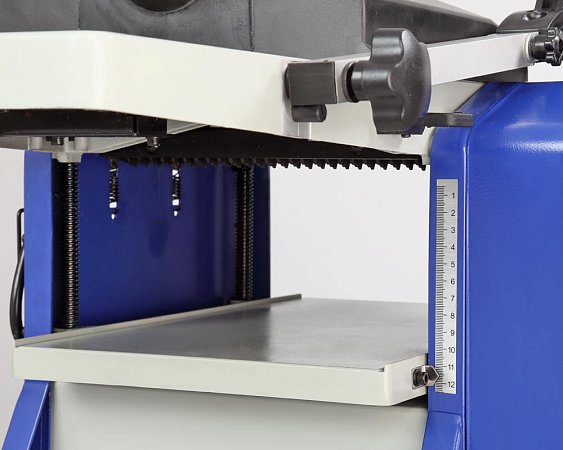 При рейсмусовании подача заготовки происходит автоматически со скоростью 7 м/мин. Нижний рабочий стол выполнен также из алюминия, его размер 380×254 мм. Нужная высота рейсмусования настраивается с помощью рукоятки. Один полный оборот рукоятки равен 3 мм. Для удобства на станке имеется шкала. Рекомендуемая глубина реза при строгании и рейсмусовании составляет от 0,5 до 1,5 мм. При максимальной ширине рекомендуется обрабатывать заготовки на глубину не более 1,3 мм.