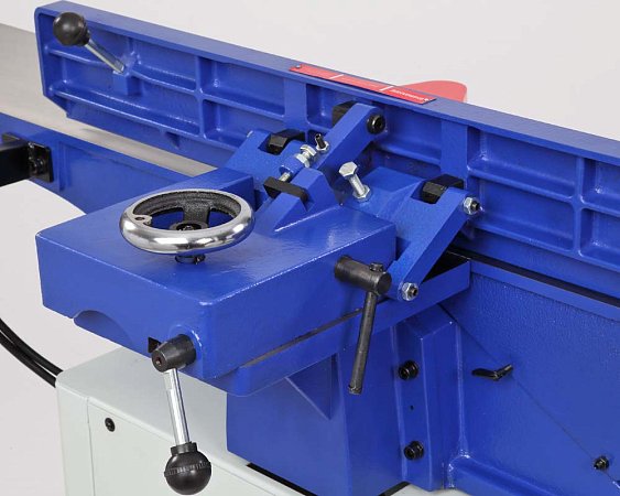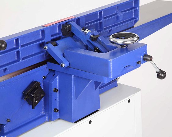 Размер параллельного упора 890 × 125 мм, он позволяет осуществлять строгание под углом 90 и 45 градусов во внешнюю и внутреннюю стороны. Способ перемещения упора – скользящий с реечным механизмом, обеспечивает более удобное и точное позиционирование на строгальных столах.