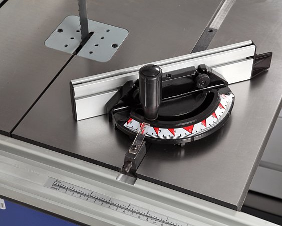 Основной стол выполнен из чугуна. Он имеет угол наклона от -5 до +45 градусов. Для работы с большими заготовками в комплектации предусмотрено расширение из листовой стали, общий размер рабочей поверхности в итоге составляет 660х450 мм. На передней направляющей с помощью эксцентрикового зажима закрепляется параллельный упор с системой точной подстройки. Она оснащена шкалами в миллиметрах и дюймах для точного позиционирования. Параллельная направляющая может устанавливаться как вертикально, так и горизонтально, в зависимости от высоты заготовки. На основном столе имеется два Т-образных паза стандартного размера 19х9,5 мм (по обе стороны от полотна) для углового упора (-60...+60 град.).