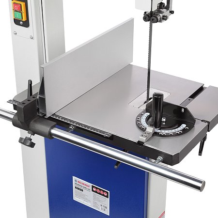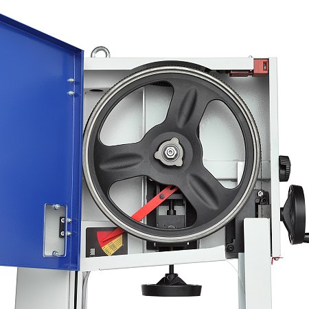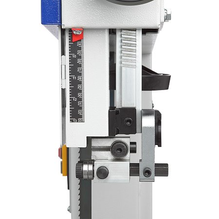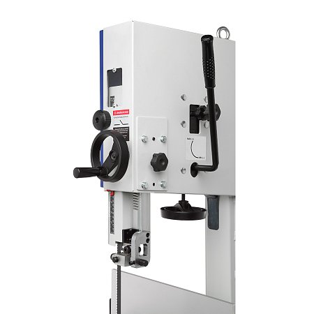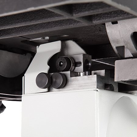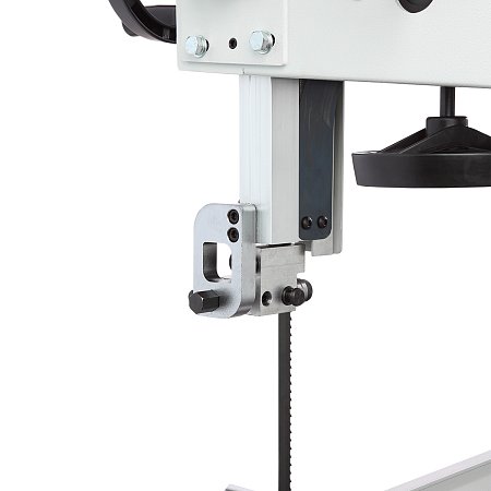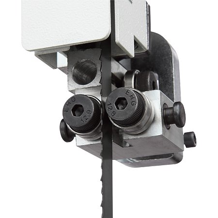 Точный рез обеспечивают несколько элементов: верхняя направляющая легко регулируется под толщину заготовки; тарельчатые опоры настраиваются, чтобы полотно не уводило в сторону; натяжение полотна отслеживается на индикаторе в смотровом окошке.