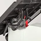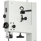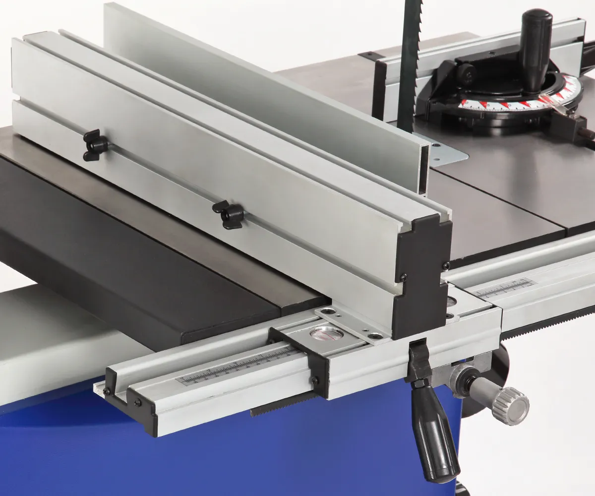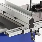 Основной стол выполнен из чугуна. Он имеет угол наклона от -5 до +45 градусов. Для работы с большими заготовками в комплектации предусмотрено расширение из листовой стали, общий размер рабочей поверхности в итоге составляет 660х450 мм. На передней направляющей с помощью эксцентрикового зажима закрепляется параллельный упор с системой точной подстройки. Она оснащена шкалами в миллиметрах и дюймах для точного позиционирования. Параллельная направляющая может устанавливаться как вертикально, так и горизонтально, в зависимости от высоты заготовки. На основном столе имеется два Т-образных паза стандартного размера 19х9,5 мм (по обе стороны от полотна) для углового упора (-60...+60 град.).