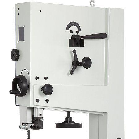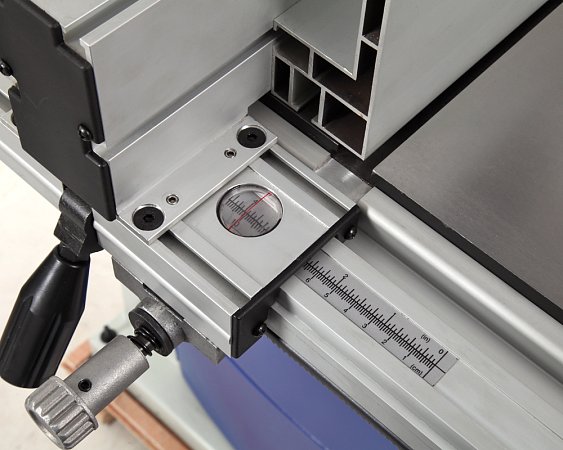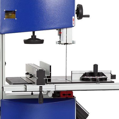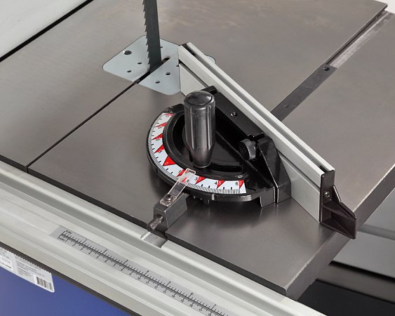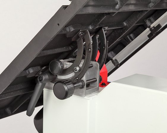 Основной стол выполнен из чугуна. Он имеет угол наклона от -5 до +45 градусов. Для работы с большими заготовками в комплектации предусмотрено расширение из листовой стали, общий размер рабочей поверхности в итоге составляет 660х450 мм. На передней направляющей с помощью эксцентрикового зажима закрепляется параллельный упор с системой точной подстройки. Она оснащена шкалами в миллиметрах и дюймах для точного позиционирования. Параллельная направляющая может устанавливаться как вертикально, так и горизонтально, в зависимости от высоты заготовки. На основном столе имеется два Т-образных паза стандартного размера 19х9,5 мм (по обе стороны от полотна) для углового упора (-60...+60 град.).