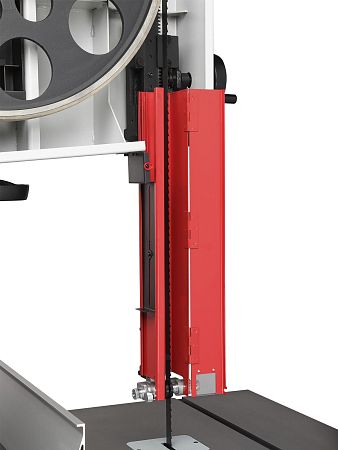 Качество и безопасность реза обеспечивает продуманная система направляющих пильного полотна. Верхний узел с маховиком быстро регулируется по высоте. Боковые опоры и задняя направляющая точно настраиваются для минимального зазора и исключения увода полотна. Натяжение контролируется по индикатору в смотровом окне.
