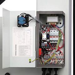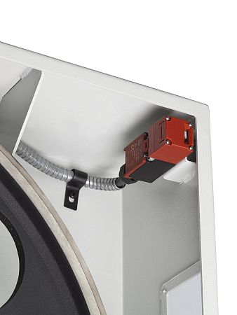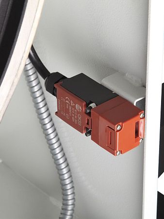 Питание станков через электромагнитный контактор, аварийная кнопка остановки и блокировка пуска при открытых дверцах обеспечивают безопасность пользователя