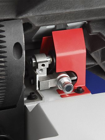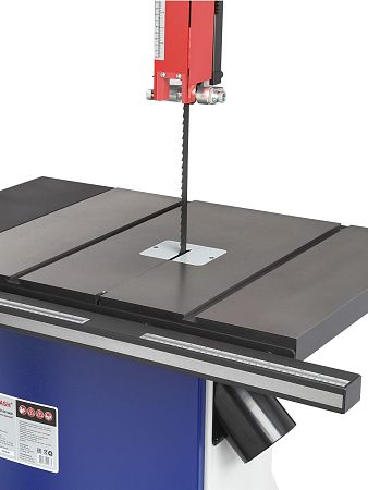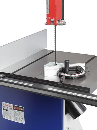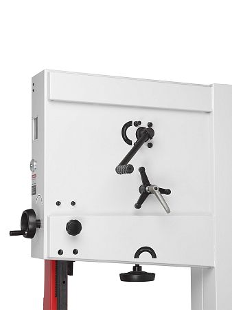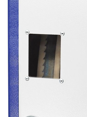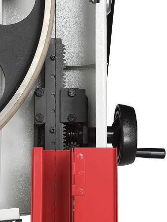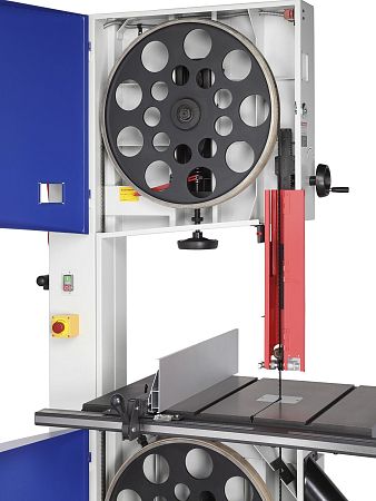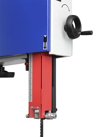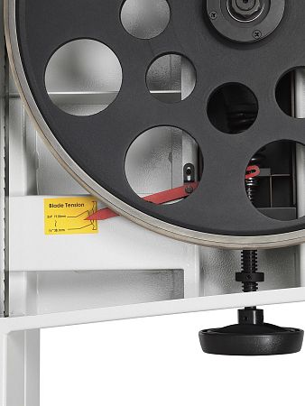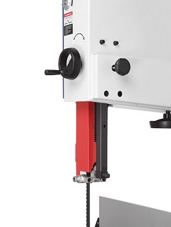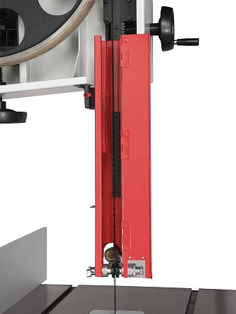 Качество и безопасность реза обеспечивает продуманная система направляющих пильного полотна. Верхний узел с маховиком быстро регулируется по высоте. Боковые опоры и задняя направляющая точно настраиваются для минимального зазора и исключения увода полотна. Натяжение контролируется по индикатору в смотровом окне.