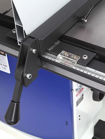 Для точного позиционирования заготовок станок комплектуется литым алюминиевым параллельным упором, который перемещается по передней направляющей и устанавливается как справа, так и слева от пильного полотна. Также он может устанавливаться как вертикально, так и горизонтально, в зависимости от высоты заготовки.