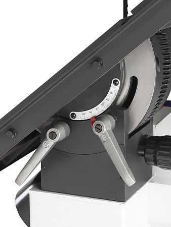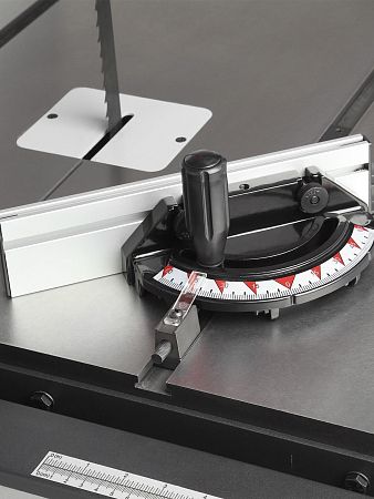 На столе, по обе стороны от полотна, имеется два Т-образных паза стандартного размера 19х9,5 мм для углового упора. Его диапазон настройки от -60° до +60° для выполнения точных угловых резов.