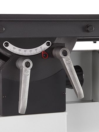 Рабочий стол из литого чугуна размером 700×900 мм и стальное расширение 200×900 мм создают просторную и виброустойчивую поверхность для работы с крупными деталями. Угол наклона стола плавно регулируется от 0° до +45°.