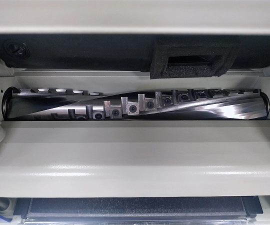 На станке установлен сегментированный ножевой вал Helical с 30 ножами, размещенными по спирали. Такое расположение лезвий обеспечивает последовательный вход в заготовку, снижает шум, вибрацию, ударные нагрузки и дает более чистый рез. Это особенно актуально при работе с твердой древесиной, а также на сучках, трещинах, свилеватых участках. Каждый сегмент имеет по четыре режущих кромки, что кратно увеличивает их ресурс: по мере необходимости лезвия переворачиваются или выборочно заменяются. Упрощенная модель без спирального вала (helical) - BELMASH P2200M.