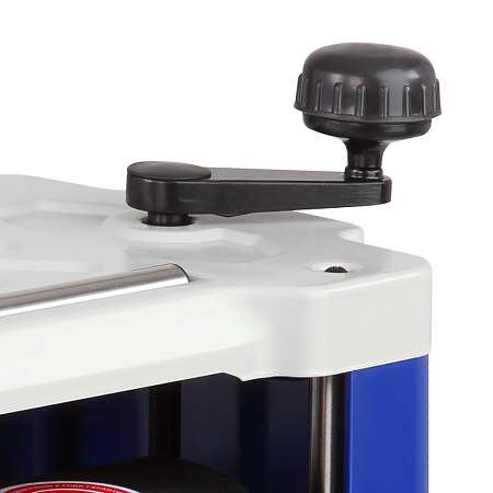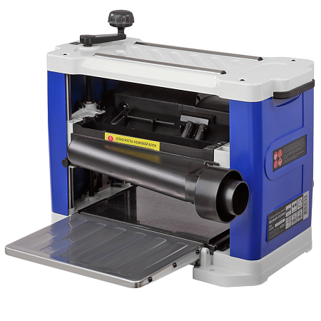 Установка конечной толщины обработки производится рукояткой точной настройки суммарной глубины строгания, расположенной на правом торце корпуса. Индикатор глубины строгания, отображает высоту снятия за один проход, рукоятка регулировки, перемещает рабочую платформу.