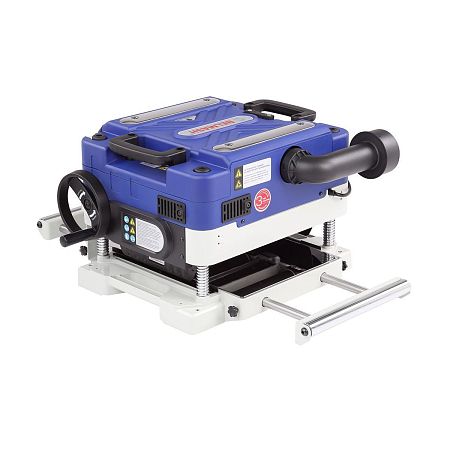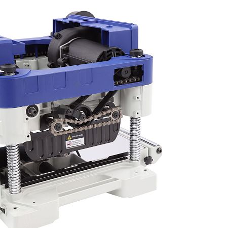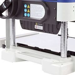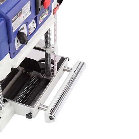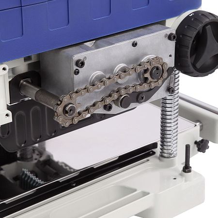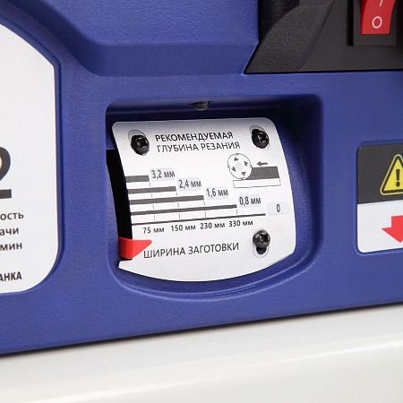 Строгальный вал диаметром 45,4 мм имеет три ножа размером 334×22×1,5 мм. Они обеспечивают качественную обработку поверхности заготовки. Двусторонние ножи экономят бюджет, при затуплении одной стороны, нож можно перевернуть и продолжить работу. Максимальная ширина заготовки составляет 330 мм. Глубина рейсмусования за один проход от 0,8 до 3,2 мм, чем шире заготовка, тем меньше глубина съёма.