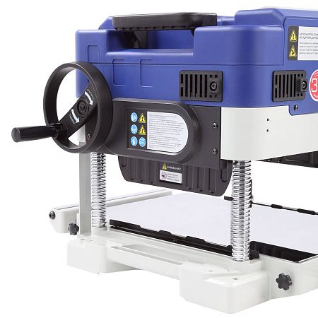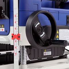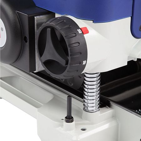 Регулировка высоты рабочей платформы осуществляется поворотом маховика с диапазоном от 5 до 152 мм. Для точной настройки предусмотрена шкала глубины строгания и ограничитель высоты с фиксацией на 5, 10, 18, 20, 25 и 30 мм. Это позволяет быстро устанавливать нужную толщину обработки и повторять параметры для серийных деталей.