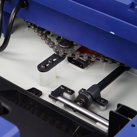 Автоматическая подача материала осуществляется двумя стальными валами с резиновым покрытием на скорости 4 или 7 м/мин. Резиновое покрытие обеспечивает надежный захват заготовки без повреждения поверхности. Для удобства работы с длинными заготовками предусмотрены выдвижные ролики размером 335×330 мм, которые поддерживают материал и облегчают работу.