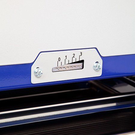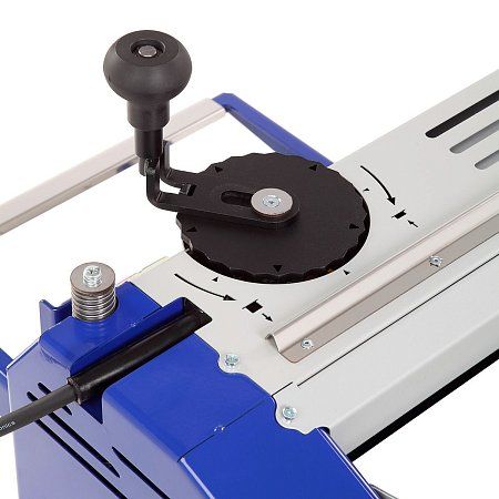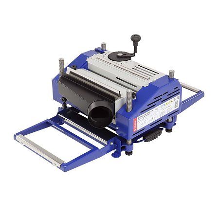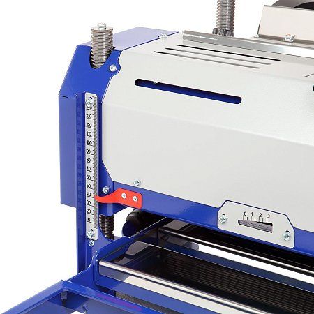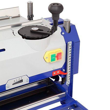 Специальный маховик позволяет максимально точно выставлять высоту обработки, вплоть до 0,1 мм. Ход режущего блока при полном обороте маховика составляет 2,5 мм. Контроль осуществляется по шкалам высоты рейсмусования и припуска.