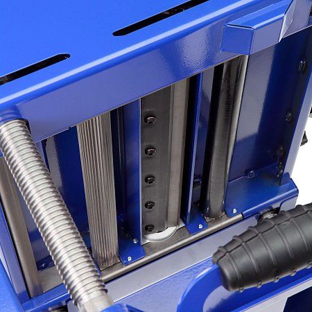 Расположение режущего узла на четырех стойках позволяет соблюдать параллельность вала относительно столов и выполнять более точную обработку. Винтовые опоры открытые, легко очищаются в процессе работы