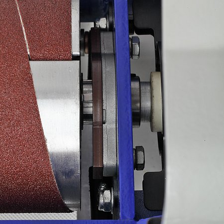 - Шлифовальный барабан имеет консольное расположение. При необходимости обработки более широких заготовок можно снять левую стойку и в два прохода обрабатывать детали шириной до 1100 мм