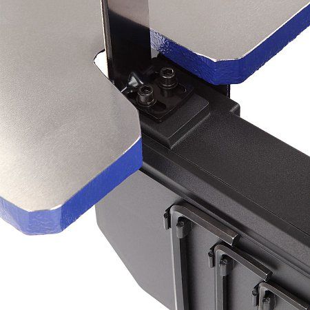 Рабочий стол изготовлен из чугуна, что гарантирует максимальную устойчивость и отсутствие вибраций. Размер стола 200x150 мм, высота над верстаком — 195 мм. Стол имеет гладкую поверхность для лучшего скольжения заготовки и возможность наклона 0-45°