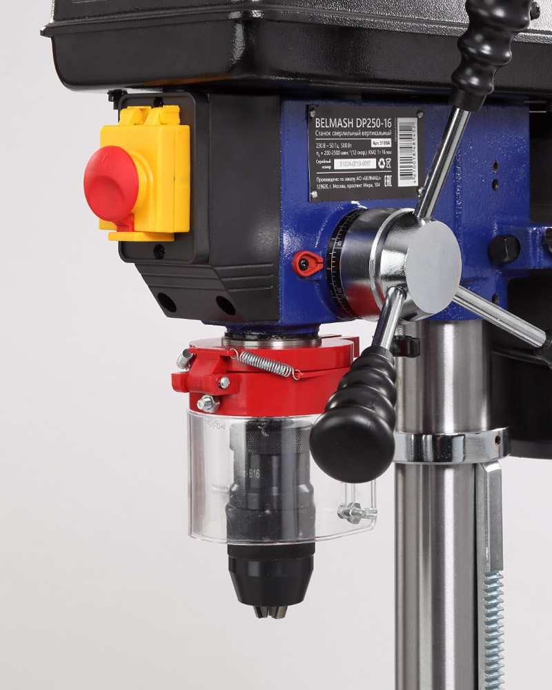 Патрон быстрозажимной с максимальным диаметром зажимаемого хвостовика инструмента 16 мм. Диаметр стойки (колонны) 60 мм, имеется зубчатая рейка, поднятие/опускание стола настраивается с помощью рукоятки.