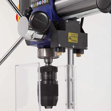Патрон быстрозажимной с максимальным диаметром зажимаемого хвостовика инструмента 16 мм. Диаметр стойки (колонны) 60 мм, на ней имеется зубчатая рейка, поднятие/опускание стола настраивается с помощью рукоятки.