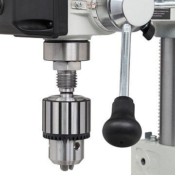 Патрон быстрозажимной с максимальным диаметром зажимаемого хвостовика инструмента 16 мм. Диаметр стойки (колонны) 73 мм, имеется зубчатая рейка, поднятие/опускание стола настраивается с помощью рукоятки.