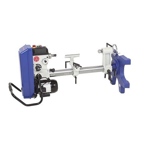 Токарный узел. Станок располагается горизонтально, превращаясь в классический токарный станок по дереву. В шпинделе передней бабки с конусом КМ2 устанавливается поводковый патрон либо фланец с закрепленной заготовкой. В пиноль задней бабки с таким же конусом КМ2 и ходом 40 мм — вращающийся центр. На этом станке можно точить заготовку длиной до 430 мм, диаметром до 280 мм, а при работе с подручником - диаметром до 180 мм, при длине обработки за проход до 150 мм.