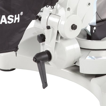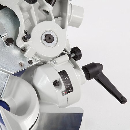Пила оснащена поворотным основным столом (-50...+50 градусов), его диаметр 315 мм. Вместе с неподвижным основанием максимальная ширина составляет 475 мм. Стол оборудован упором со шкалой на правой стороне (0-240 мм). На упоре можно закрепить струбцину или устройство для резки заготовок одинаковой длины (входят в комплект поставки).