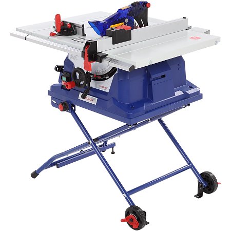 Параллельный упор также можно поставить как справа, так и слева от пильного диска. На передней направляющей параллельного упора есть шкалы для точного позиционирования. Шкалами снабжены и штанги боковых столов. В комплектации этой модели есть дополнительное приспособление - упор для работы с узкими заготовками. он устанавливается как накладка на параллельную направляющую. Корпус изделия закрытый, изготовлен из пластика. Снабжен специальными держателями для упоров, толкателя, ключей и пильного диска.