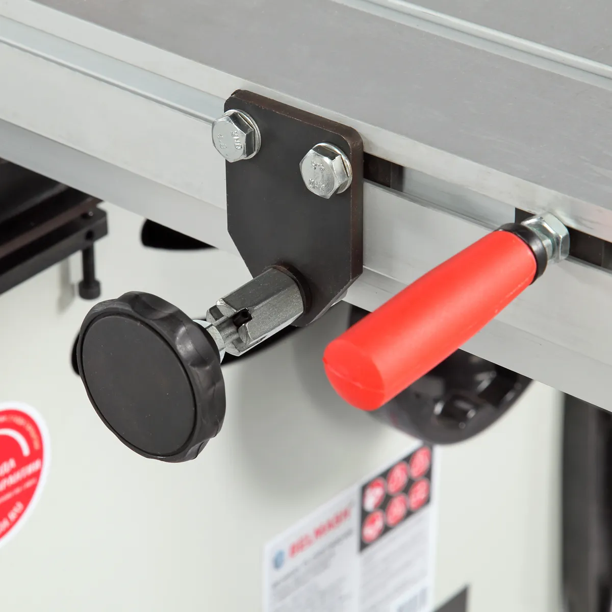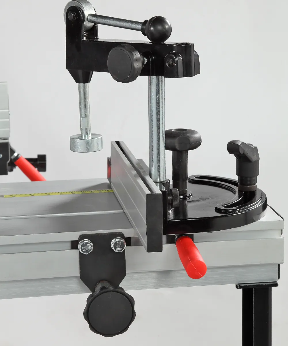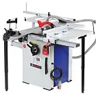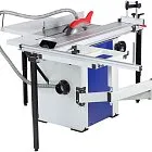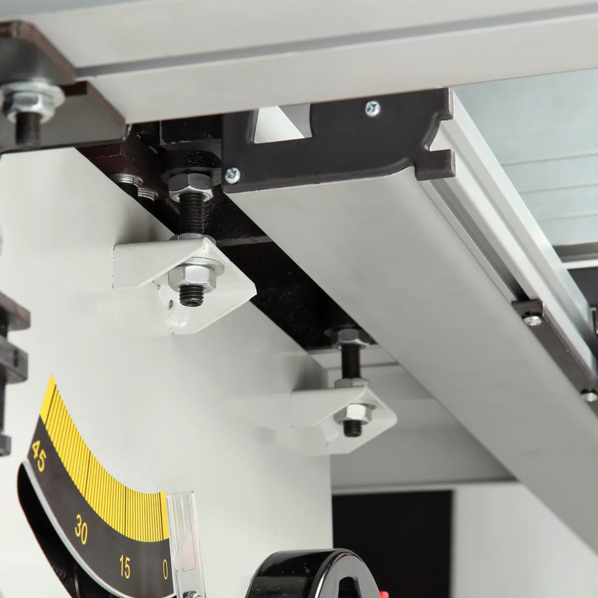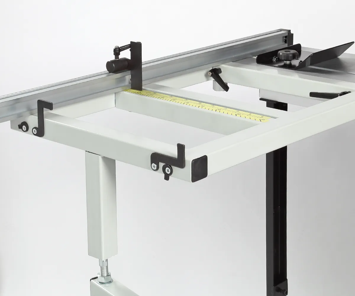 Станок оснащен основным чугунным столом, двумя дополнительными секциями из листовой стали, подвижным столом из алюминиевого профиля и столом поперечного реза из стального профиля. Основной и подвижный столы имеют по одному пазу для установки угловых упоров или дополнительных приспособлений. Конструкция подвижного стола рассчитана на нагрузки. Кронштейн изготовлен из толстостенного стального профиля. Шарнирный механизм выполнен с использованием шариковых подшипников.