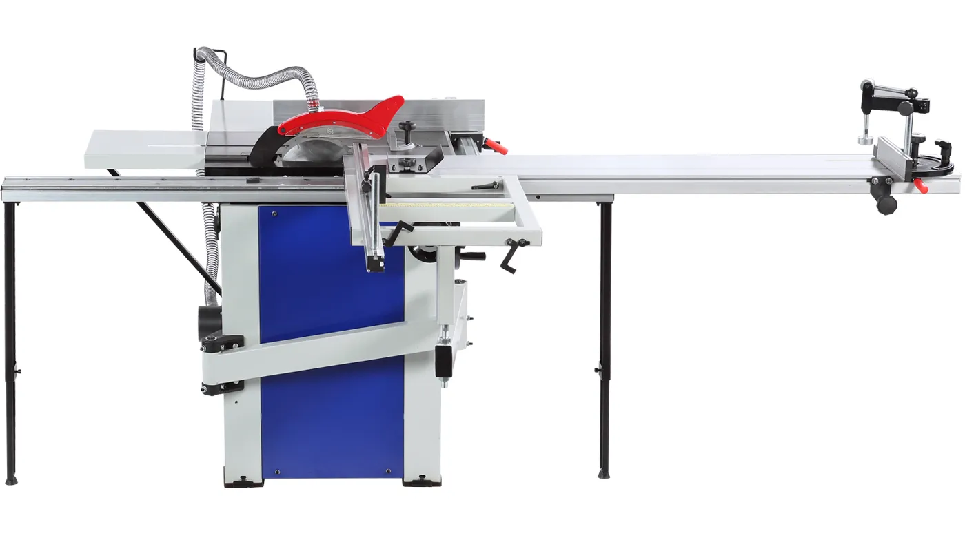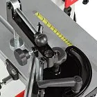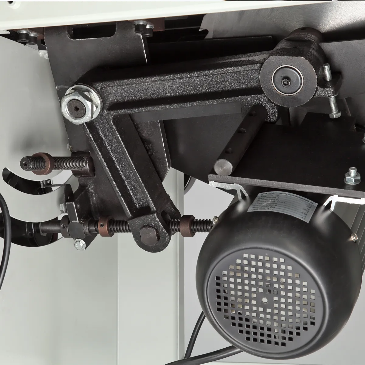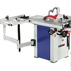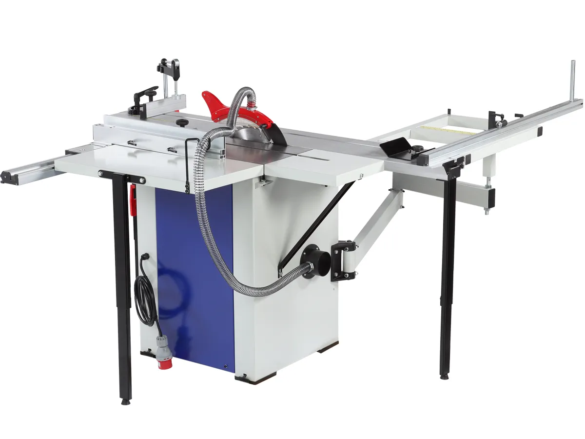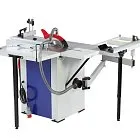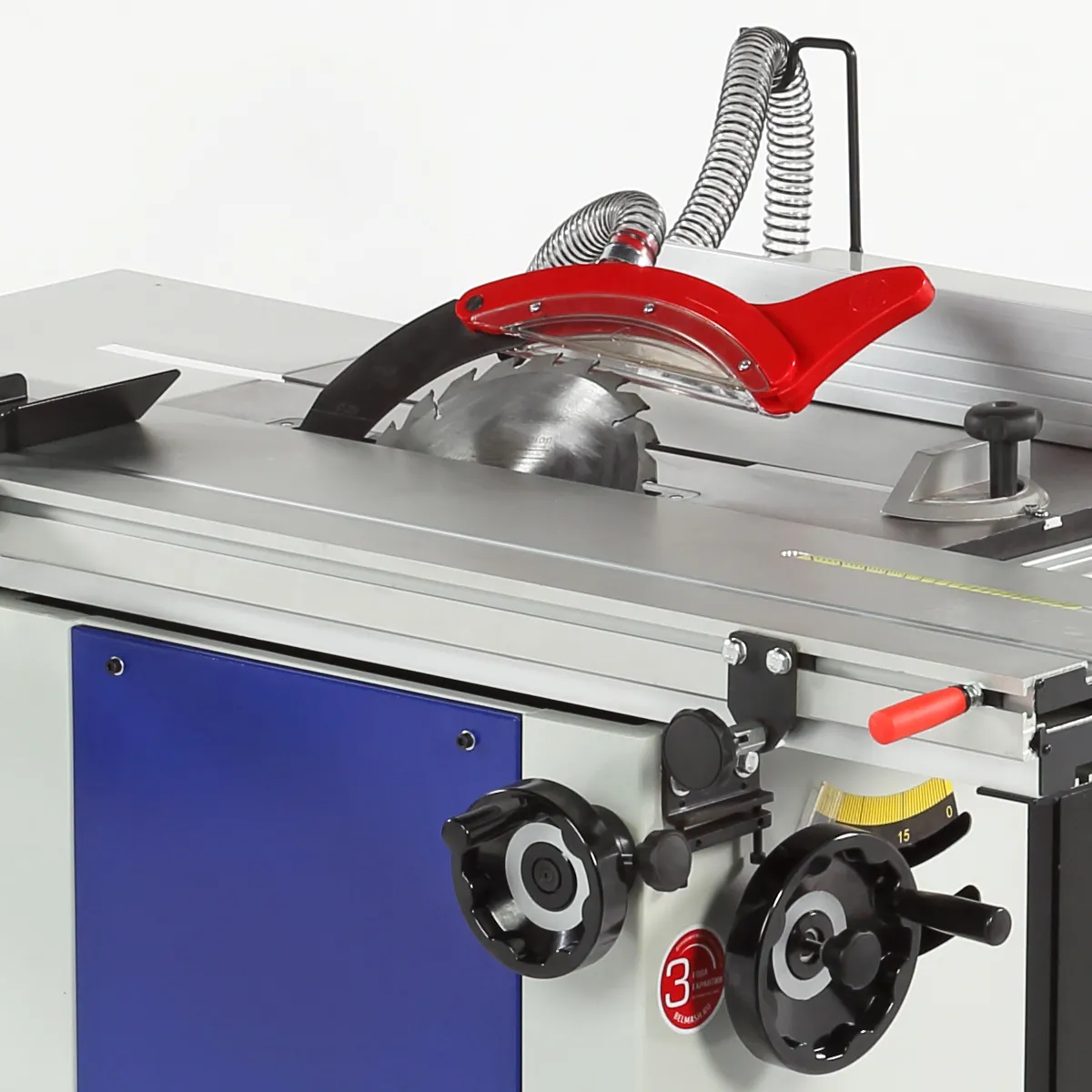 Станок оснащен основным чугунным столом, двумя дополнительными секциями из листовой стали, подвижным столом из алюминиевого профиля и столом поперечного реза из стального профиля. Основной и подвижный столы имеют по одному пазу для установки угловых упоров или дополнительных приспособлений. Конструкция подвижного стола рассчитана на нагрузки. Кронштейн изготовлен из толстостенного стального профиля. Шарнирный механизм выполнен с использованием шариковых подшипников.