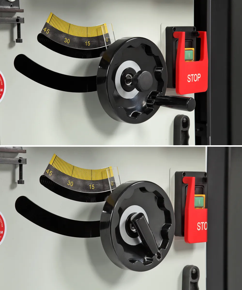 - Высота пропила под углом 90° - 80 мм, 45° - 55 мм. Регулировка угла наклона и высоты пильного диска с помощью маховиков на корпусе станка