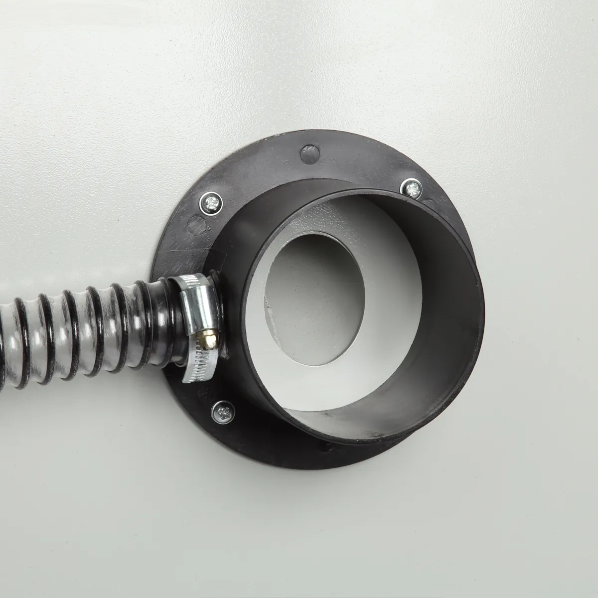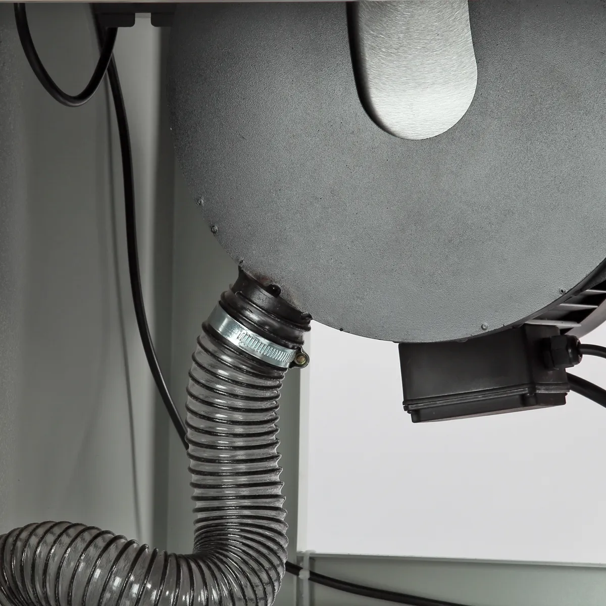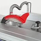 Патрубки для отвода стружки подходят к зоне реза: на корпусе станка и на предохранительном кожухе пильного диска. Шланги от зоны реза подведены к единому патрубку для отведения отходов (сзади на корпусе).
