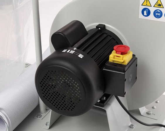 Двигатель асинхронный, мощность 1500 Вт, крыльчатка стальная. Одно из достоинств данной модели - переходной адаптер, который дает возможность подключить ее сразу к двум точкам удаления отходов резания (у одного станка или к разным станкам).