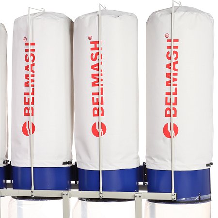 Монтаж/демонтаж фильтр-мешков и мешков-стружкосборников не требует ни специального инструмента, ни большого количества времени, благодаря специальным зажимам. Фильтр-мешки очищаются без снятия, путем стряхивания пыли внутрь. Уровень очистки составляет 5 мкм, этого достаточно для работы не только с распиловочными и строгальными станками, но и с оборудованием, дающие мелкую взвесь – шлифовальными, фрезерными, рейсмусовыми станками. Четыре вместительных стружкосборника, объемом по 157 литров каждый, способствуют длительной работе без их частой смены.