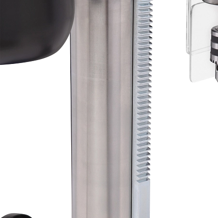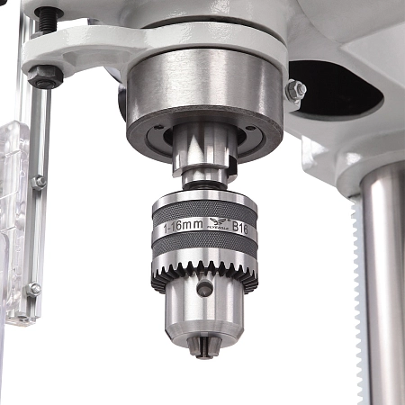 Ход шпинделя составляет 90 мм, что обеспечивает достаточный диапазон перемещения при сверлении и фрезеровании. В комплект входит переходная втулка КМ3–КМ2, позволяющая применять инструмент с конусом Морзе 2. Диаметр зажимаемого инструмента в патроне — от 1 до 16 мм.