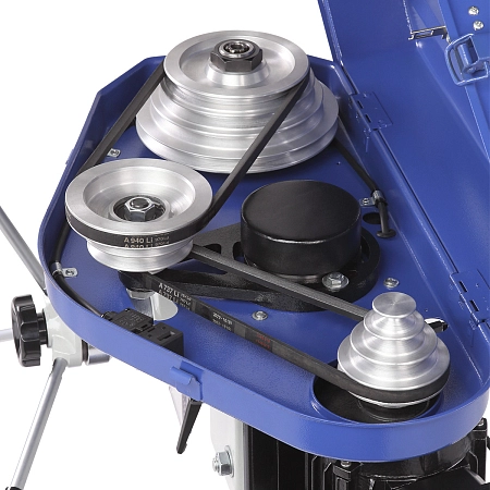 Передача вращения на шпиндель осуществляется ременной передачей с двумя клиновыми ремнями. Перестановка ремней по ручьям шкивов обеспечивает 12 скоростей вращения в диапазоне 100–2150 об/мин. Такая схема снижает вибрации и шум, обеспечивает стабильную передачу крутящего момента и защищает узлы станка при перегрузке.