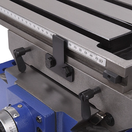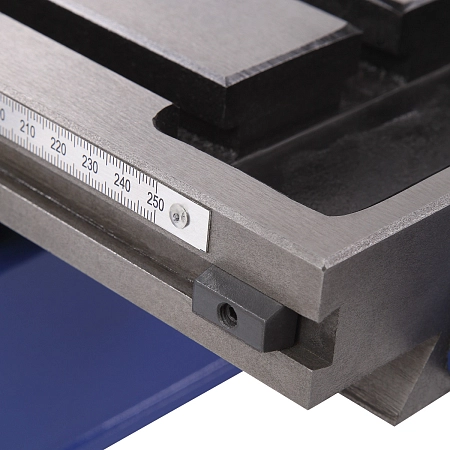 Для удобства настройки стол оснащен линейкой продольного хода. Ее ключевая особенность — шкала с диапазоном ±250 мм. Это позволяет вести отсчет положения детали от центра стола в обе стороны.