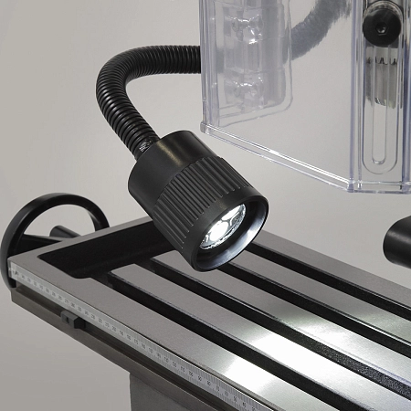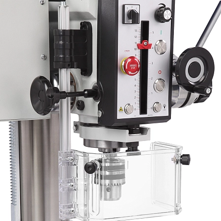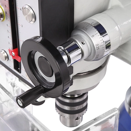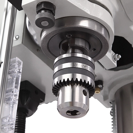 Полный ход шпинделя составляет 130 мм, что обеспечивает достаточный диапазон перемещения при сверлении и фрезеровании. Диаметр зажимаемого инструмента в патроне — от 1 до 16 мм.