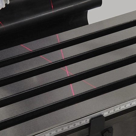 Для удобства настройки стол оснащен линейкой продольного хода. Ее ключевая особенность — шкала с диапазоном ±350 мм. Это позволяет вести отсчет положения детали от центра стола в обе стороны.