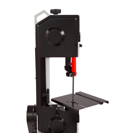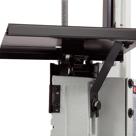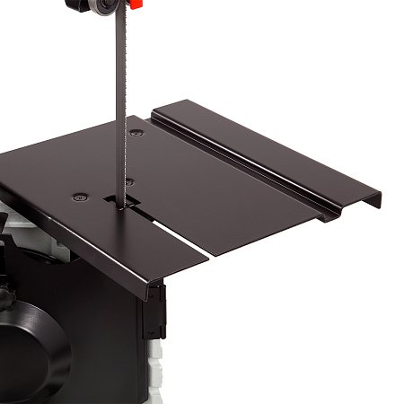 Отличительная особенность модели - возможность реза в горизонтальном и вертикальном положении пильной рамы. Последнее особенно эффективно при обработке плоских заготовок. Для перевода станка в вертикальный режим установите дополнительный рабочий стол (240×245 мм), входящий в комплектацию. Для удобства работы используйте упор.
