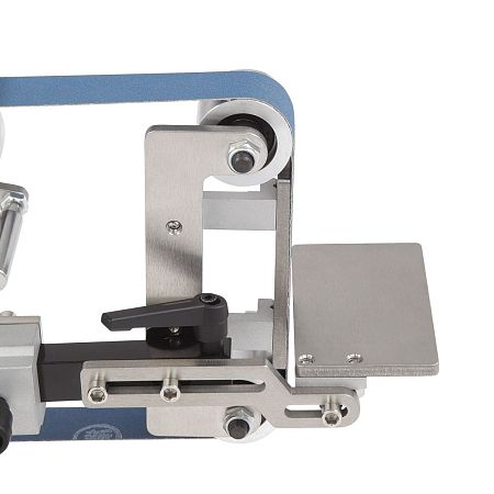 Поворотная консоль регулируется от –15° до +20°, что делает станок удобным для радиусной и фасонной обработки. Контактный ролик диаметром 100 мм, выполненный из алюминия с резиновым покрытием, обеспечивает стабильное натяжение и плавный ход ленты.