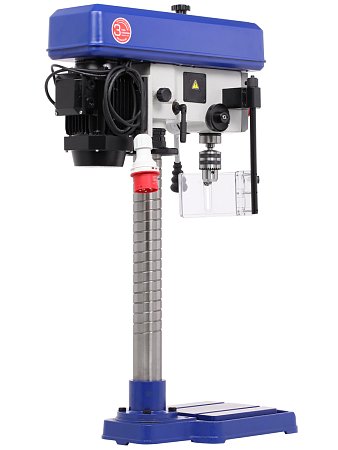 Станок способен сверлить отверстия с максимальным диаметром до 13 мм (в металле) и до 50 мм (в древесине). Патрон ключевой трехкулачковый, с возможностью установки инструмента с хвостовиком до 13 мм. Вращающий момент с вала двигателя на шпиндель передается с помощью клиноременной передачи. Скоростей у данной модели пять: 200, 580, 960, 1550 и 2400 об./мин. Изменить частоту вращения можно переброской ремня на нужную ступень шкивов.