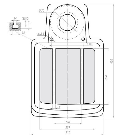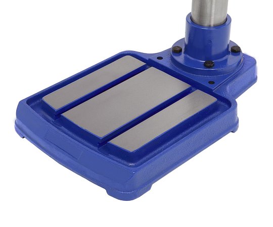 Основание станка чугунное. Оно в данной модели является и рабочим столом, габаритные размеры - 310×490 мм, рабочая поверхность - 237×240 мм. На нем предусмотрены два Т-образных паза для установки тисков или других зажимных приспособлений (в комплект поставки не входят).