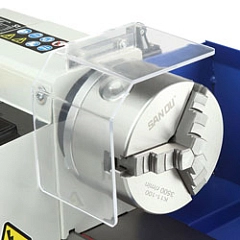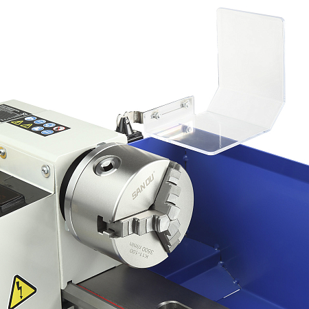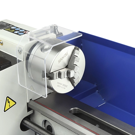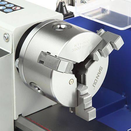 Трёхкулачковый патрон диаметром 100 мм с широким диапазоном зажима обеспечивает надёжную фиксацию заготовок. Поддержка автоподачи при нарезании резьбы и диапазон метрических резьб 0,5-2,5 мм делают станок удобным для точных и повторяемых работ.