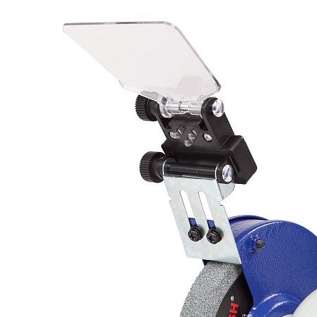 Защитный экран обеспечивает безопасность от разлетающейся горячей металлической стружки и искр. Регулируемый упор для обрабатываемого материала имеет возможность перемещения ближе или дальше относительно заточного диска, что помогает лучше настроить рабочий процесс. Энергонезависимый узел подсветки позволяет работать в темное время суток или в помещениях с плохим освещением.