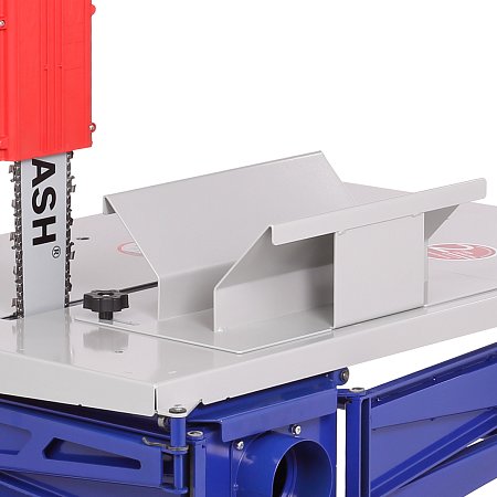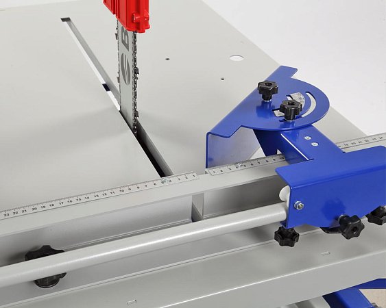 Рабочий стол станка подвижный, перемещается «вдоль шины». К основанию он крепится с помощью системы подвижных кронштейнов. Для проведения прямых резов на рабочий стол перпендикулярно шине устанавливают упор, на котором имеется круглая ось — рукоятка. Взявшись за неё, удобно перемещать стол, не поднося руки близко к цепи. Если нужна резка под углом, на оси закрепляют специальный угловой упор с возможностью настройки требуемого угла. Станок позволяет также снимать фаски с блоков. Эту операцию проводят с помощью фасочного упора.