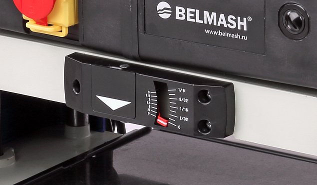 Индикатор используется на рейсмусовых станках BELMASH P1500M, P2200M, P2200MH. Представляет собой пластиковый корпус (ABS) со шкалой и механизмом указателя. На корпусе предусмотрены три отверстия для крепления индикатора к корпусу платформы режущего блока.