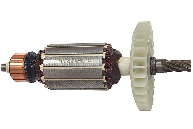 Ротор используется в коллекторном двигателе торцовочной пилы BELMASH MS B-255. Маркировка на узле - HM210426. Диаметр крыльчатки 79 мм, материал - пластик.